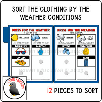 Students can sort 12 items of clothing by the weather conditions outside. For example - what would they wear if it was hot & sunny out? Maybe some sunglasses, flip-flops and shorts.