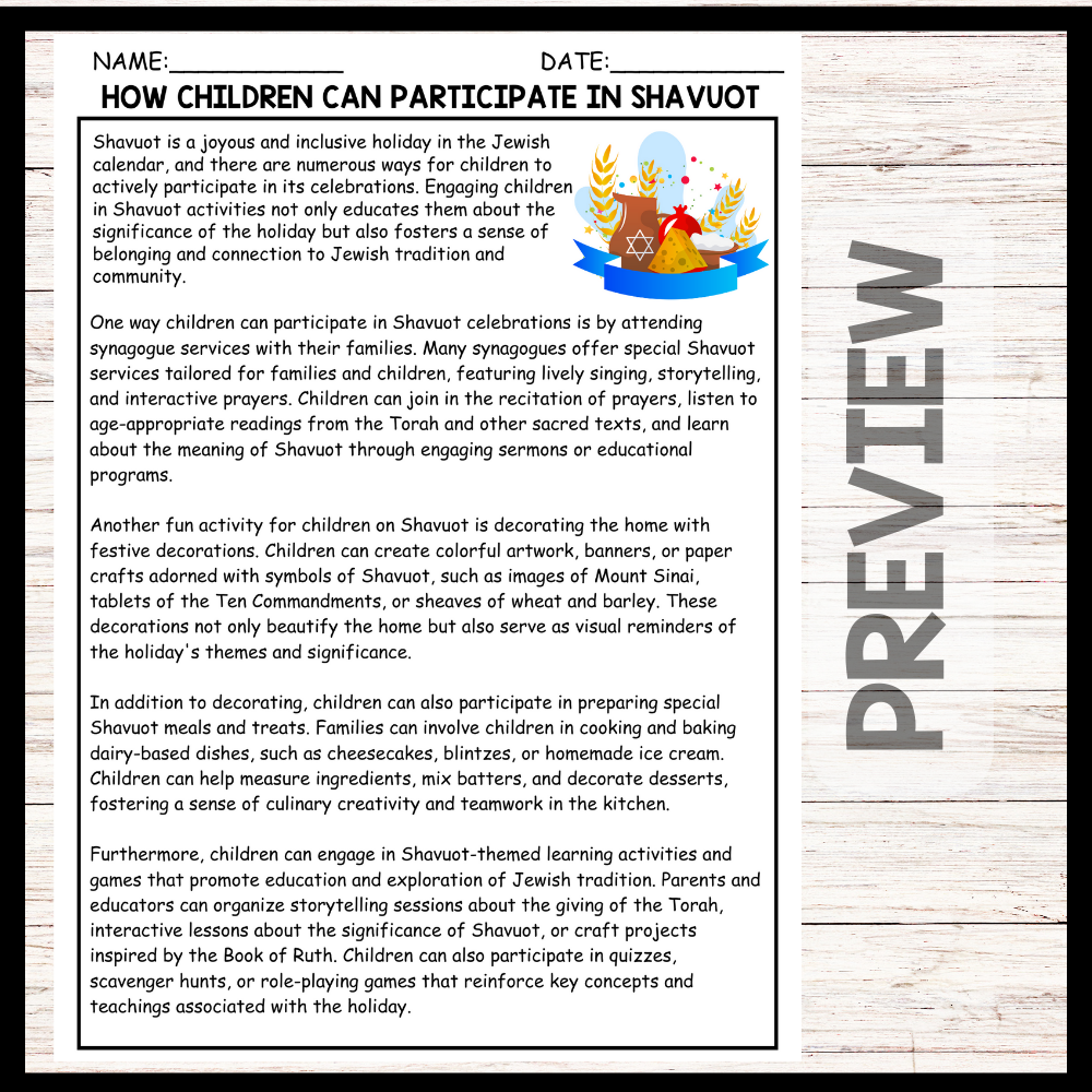 - "HOW CHILDREN CAN PARTICIPATE IN SHAVUOT" SHAVUOT Reading Comprehension