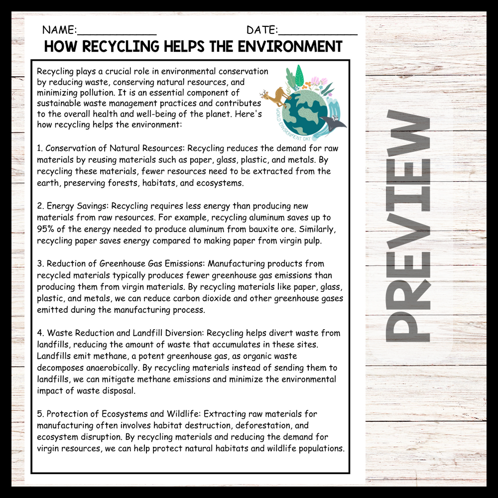 - "HOW RECYCLING HELPS THE ENVIRONMENT" ENVIRONMENT DAY Reading Comprehension