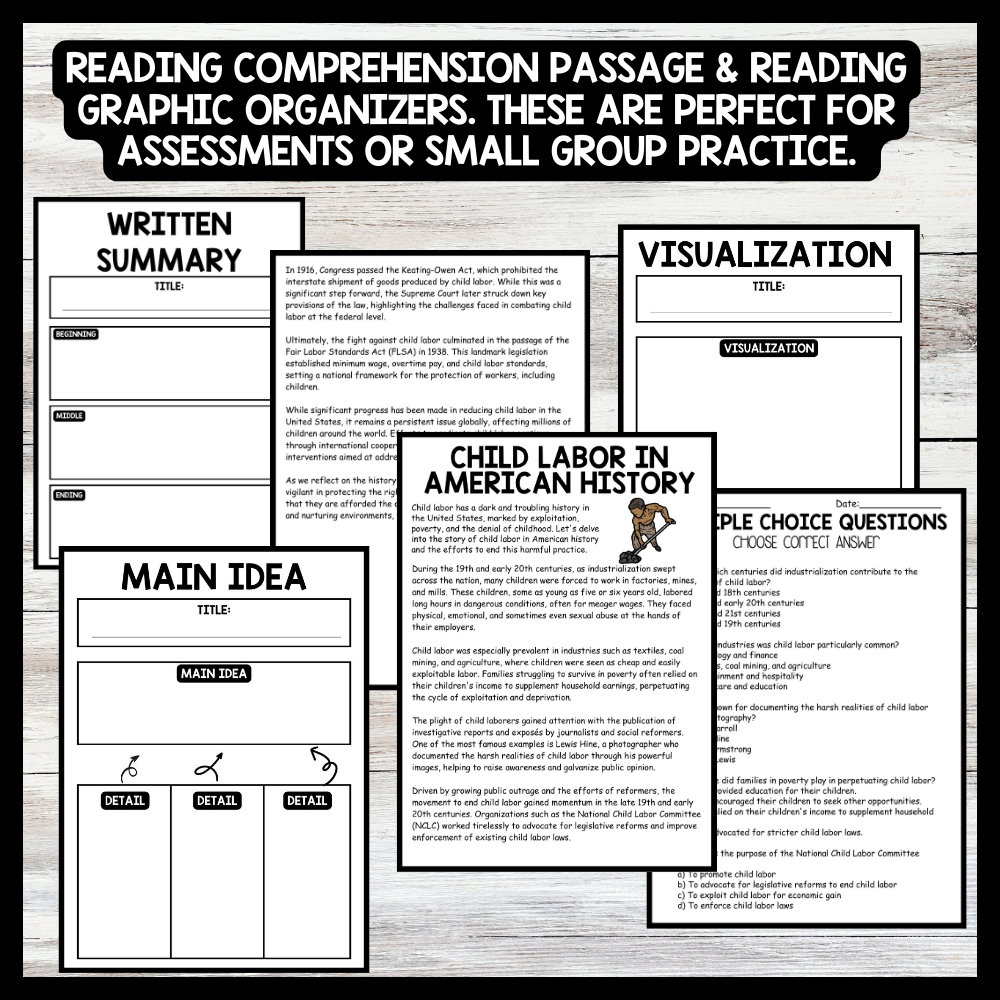 Grow your students knowledge with this Nonfiction Reading Comprehension Passage - Labor History Month - Child Labor in American History These reading practice passages are perfect for: warm-up, bell work, homework, or weekly assessments. Students can use independently in literacy...View more
