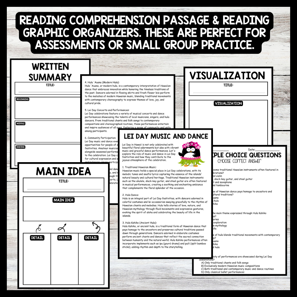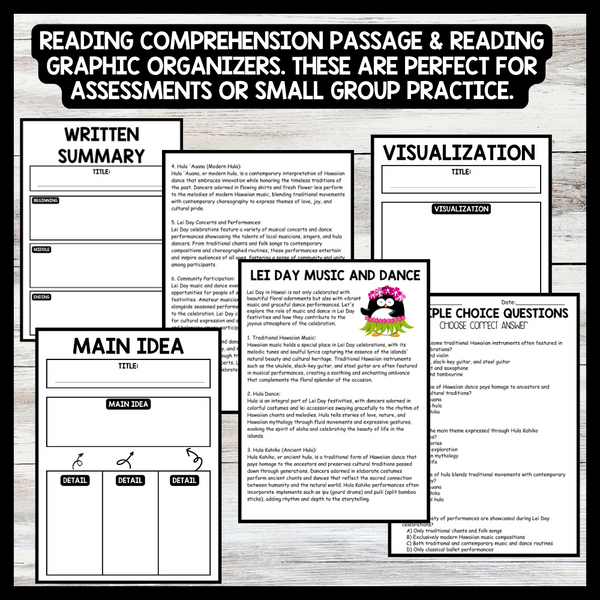 Different options provided- multiple choice, written response or graphic organizers to focus on individual skill.