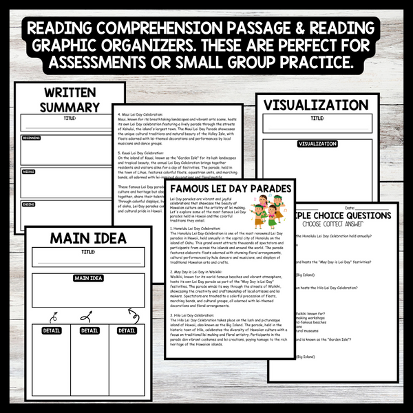 Different options provided- multiple choice, written response or graphic organizers to focus on individual skill.