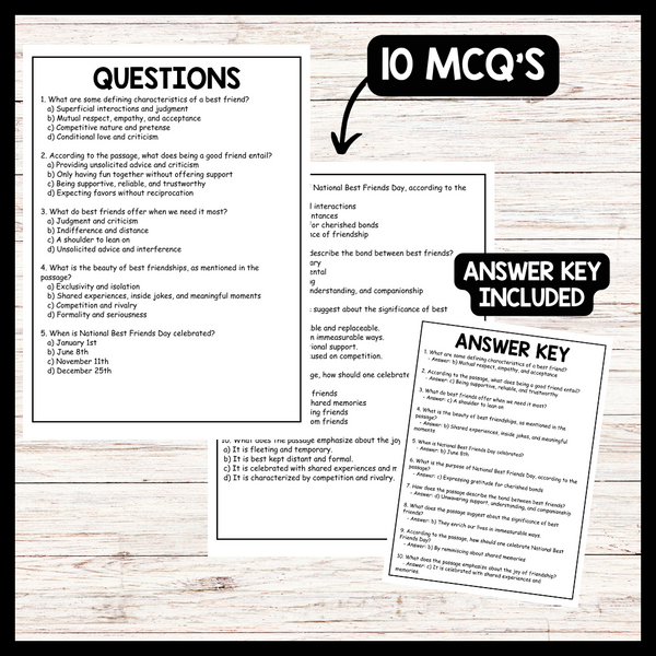 This passage beautifully captures the essence of best friendships and the qualities that define them. Teachers can use it in class to initiate discussions about the importance of friendship, empathy, and support in students' lives. They can encourage students to reflect on their own friendships and discuss what qualities they value most in their friends. Additionally, teachers can use this passage to inspire writing activities where students can write letters or create artwork expressing gratitude for their best friends on National Best Friends Day. Overall, this passage serves as a heartfelt reminder of the significance of friendship and the bonds that enrich our lives.