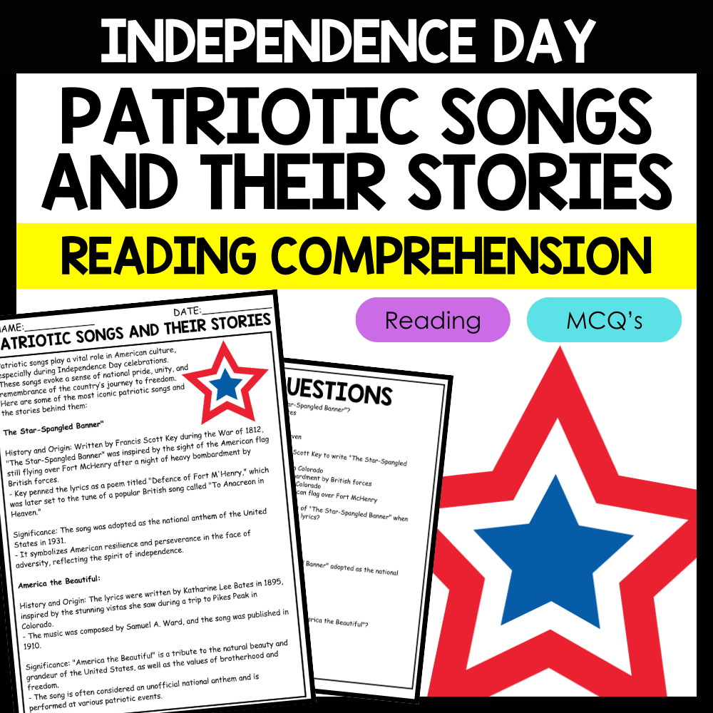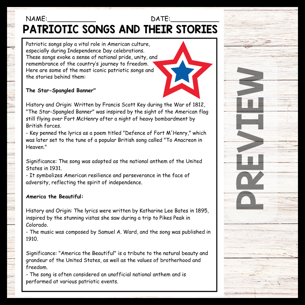 - Patriotic Songs and Their Stories - 4th of july Reading comprehension Passage and Questions