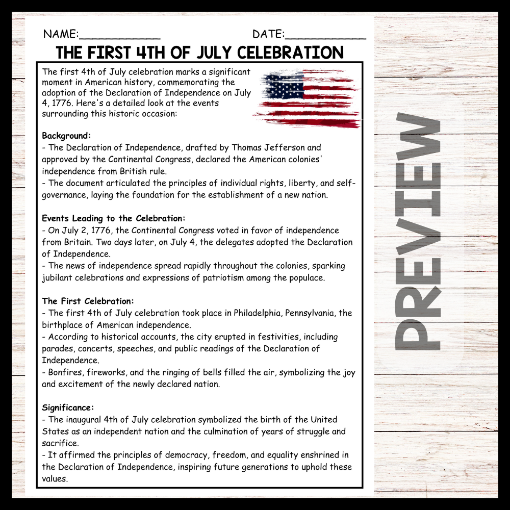 - The First 4th of July Celebration Reading comprehension Passage and Questions