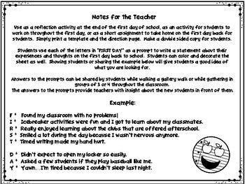 Use as a reflection activity at the end of the first day of school, as an activity for students to work on throughout the first day, or as a short assignment to take home on the first day back for students. Simply print a template and the direction page. Make a double sided copy for students.