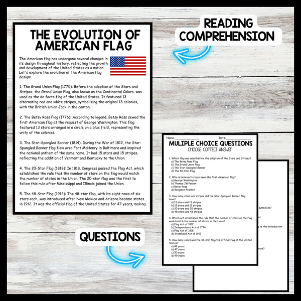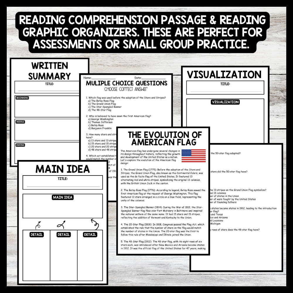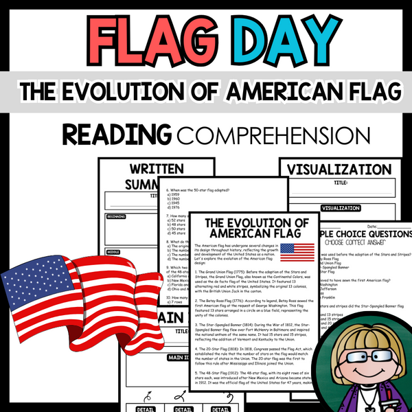 Grow your students knowledge with this Nonfiction Reading Comprehension Passage - Flag Day - The Evolution of American Flag These reading practice passages are perfect for: warm-up, bell work, homework, or weekly assessments. Students can use independently in literacy groups,...View more