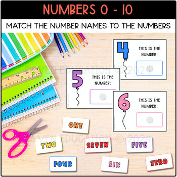Perfect activity for working on number recognition and matching skills. This set includes 11 task cards, each one featuring a balloon shaped like a number from 0 to 10. Students will match the number names to the balloon numbers.