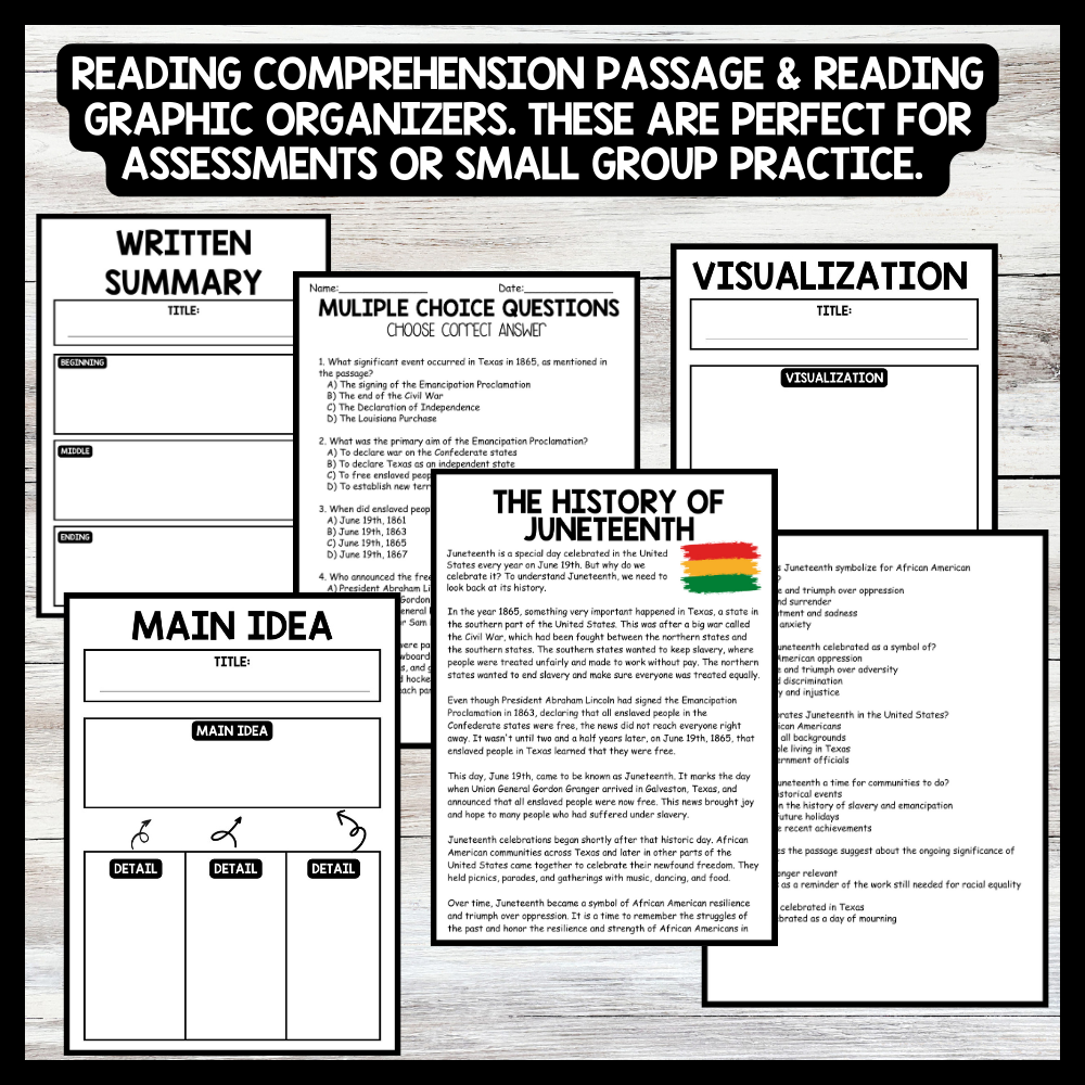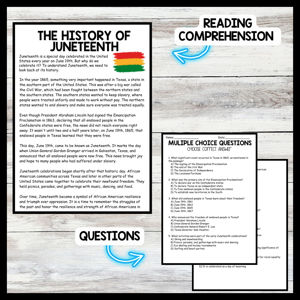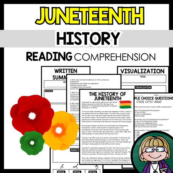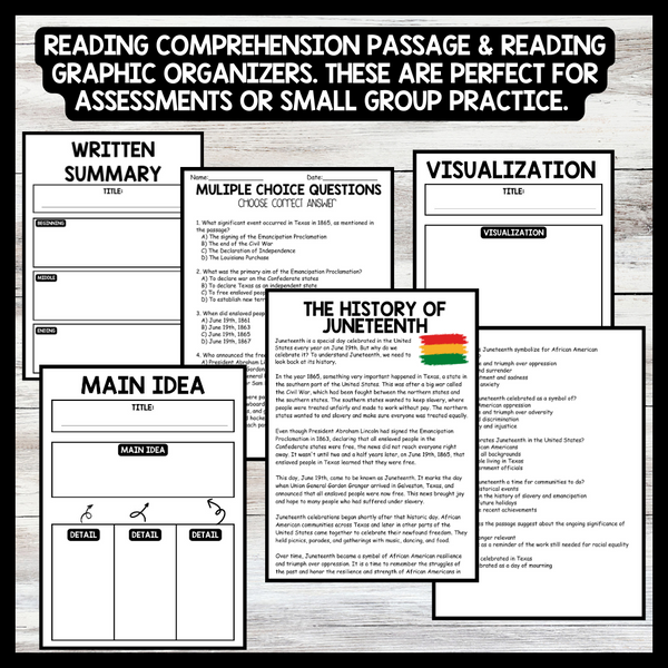 Grow your students knowledge with this Nonfiction Reading Comprehension Passage - Juneteenth - History These reading practice passages are perfect for: warm-up, bell work, homework, or weekly assessments. Students can use independently in literacy groups, guided reading groups. Different options...View more
