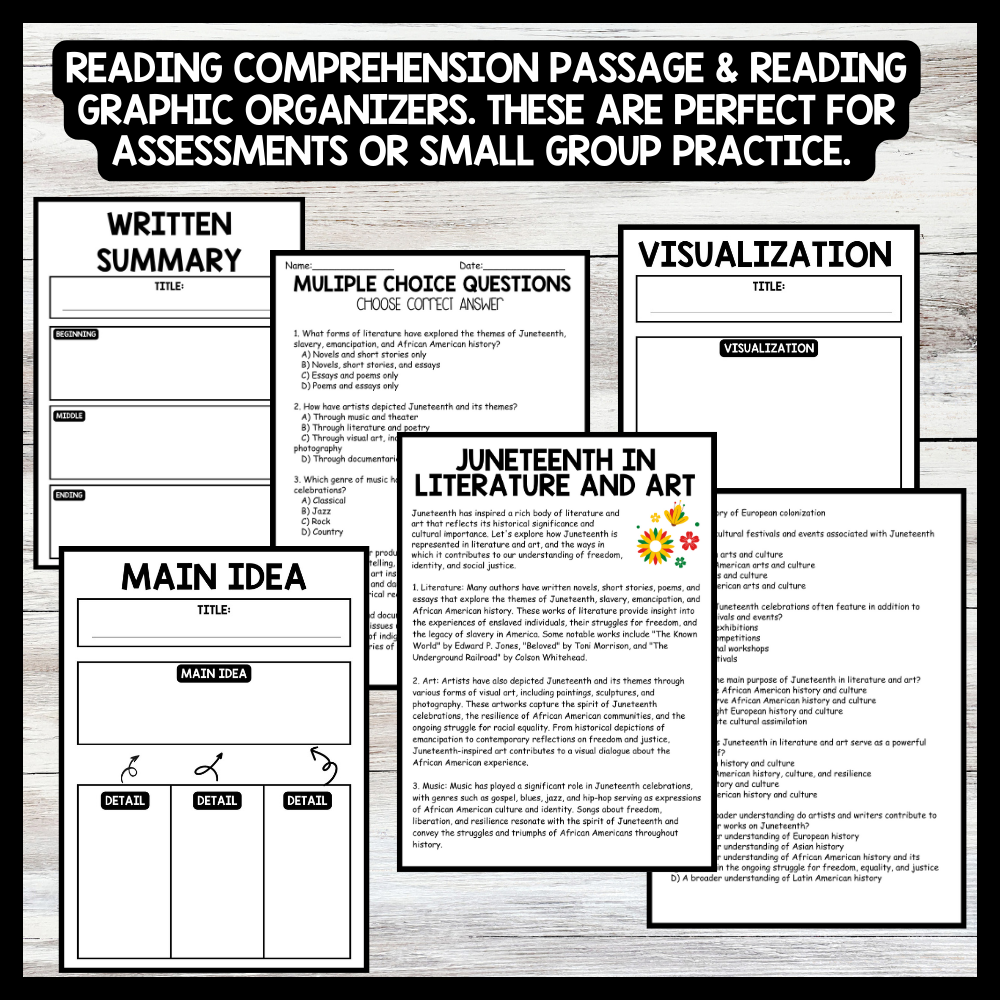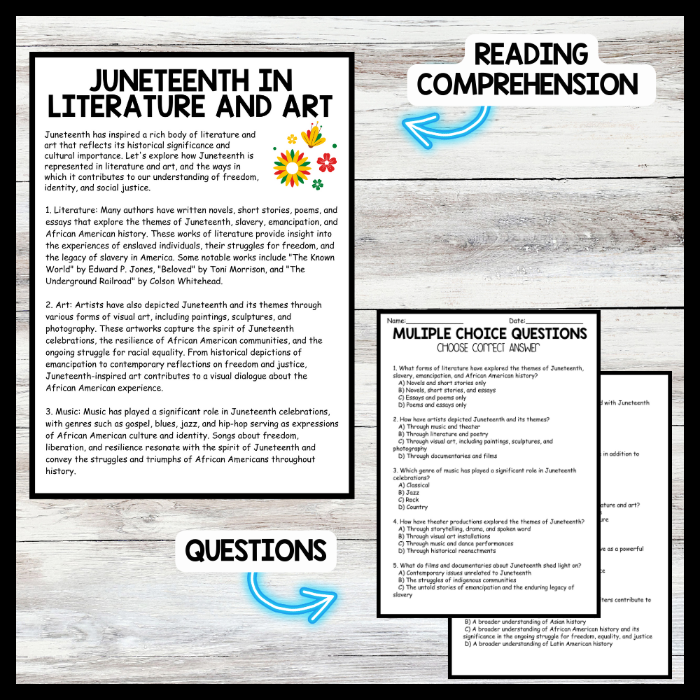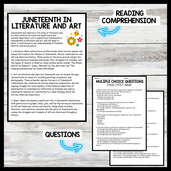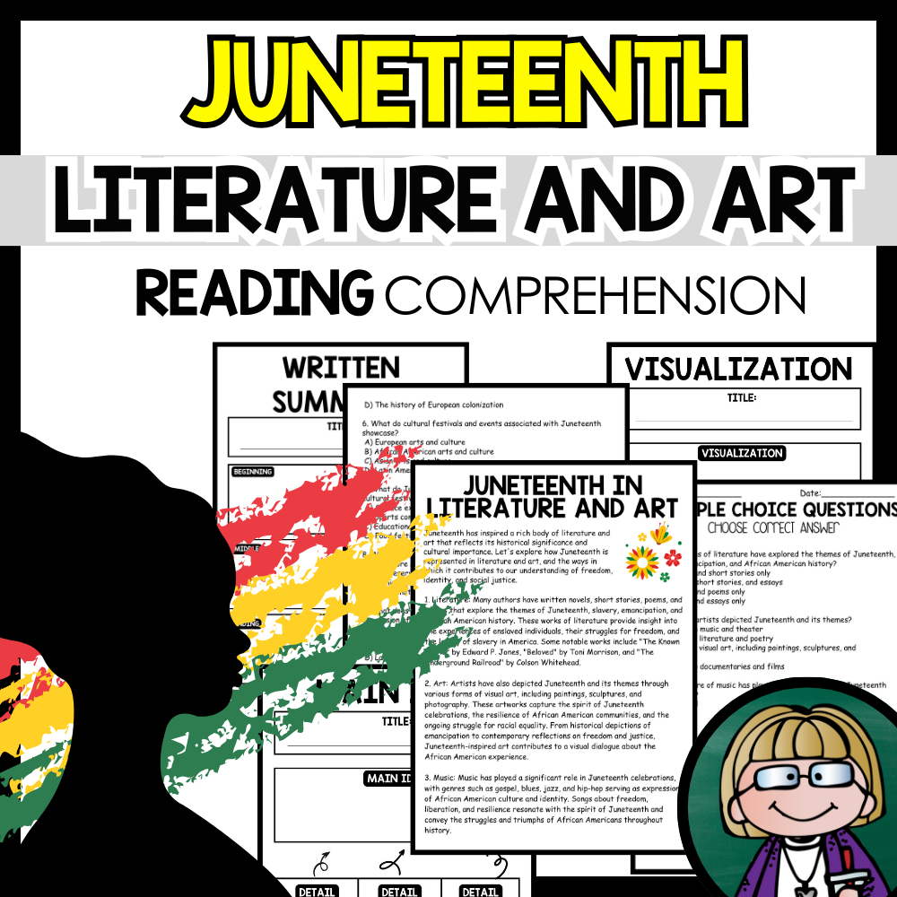 Grow your students knowledge with this Nonfiction Reading Comprehension Passage - Juneteenth - Literature and Art These reading practice passages are perfect for: warm-up, bell work, homework, or weekly assessments. Students can use independently in literacy groups, guided reading groups....View more
