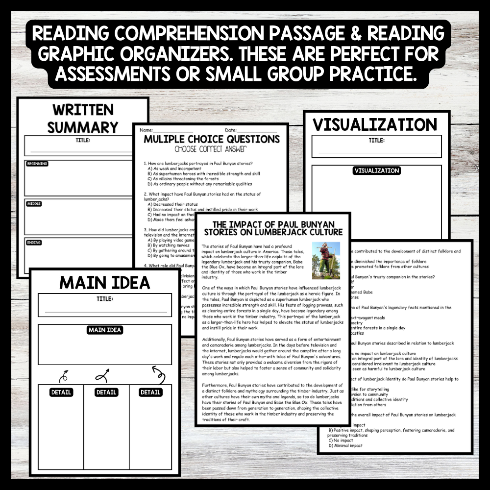 Grow your students knowledge with this Nonfiction Reading Comprehension Passage - Paul Bunyan Day - IMpact These reading practice passages are perfect for: warm-up, bell work, homework, or weekly assessments. Students can use independently in literacy groups, guided reading groups....View more