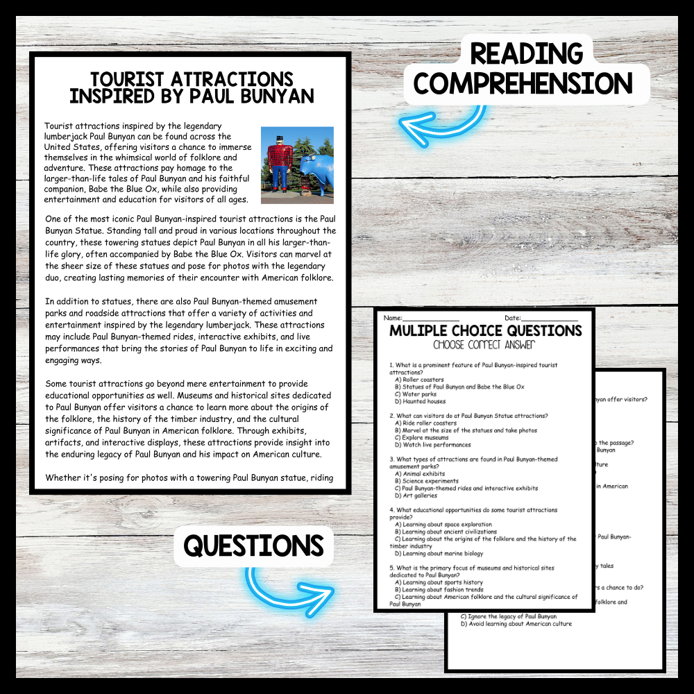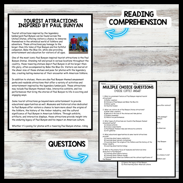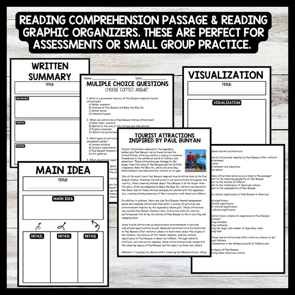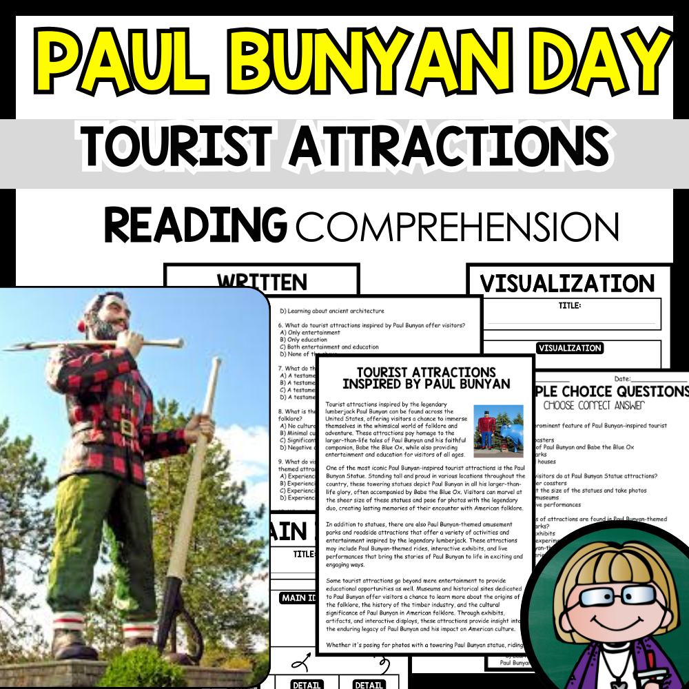 Grow your students knowledge with this Nonfiction Reading Comprehension Passage - Paul Bunyan Day - Tourist Attractions These reading practice passages are perfect for: warm-up, bell work, homework, or weekly assessments. Students can use independently in literacy groups, guided reading...View more