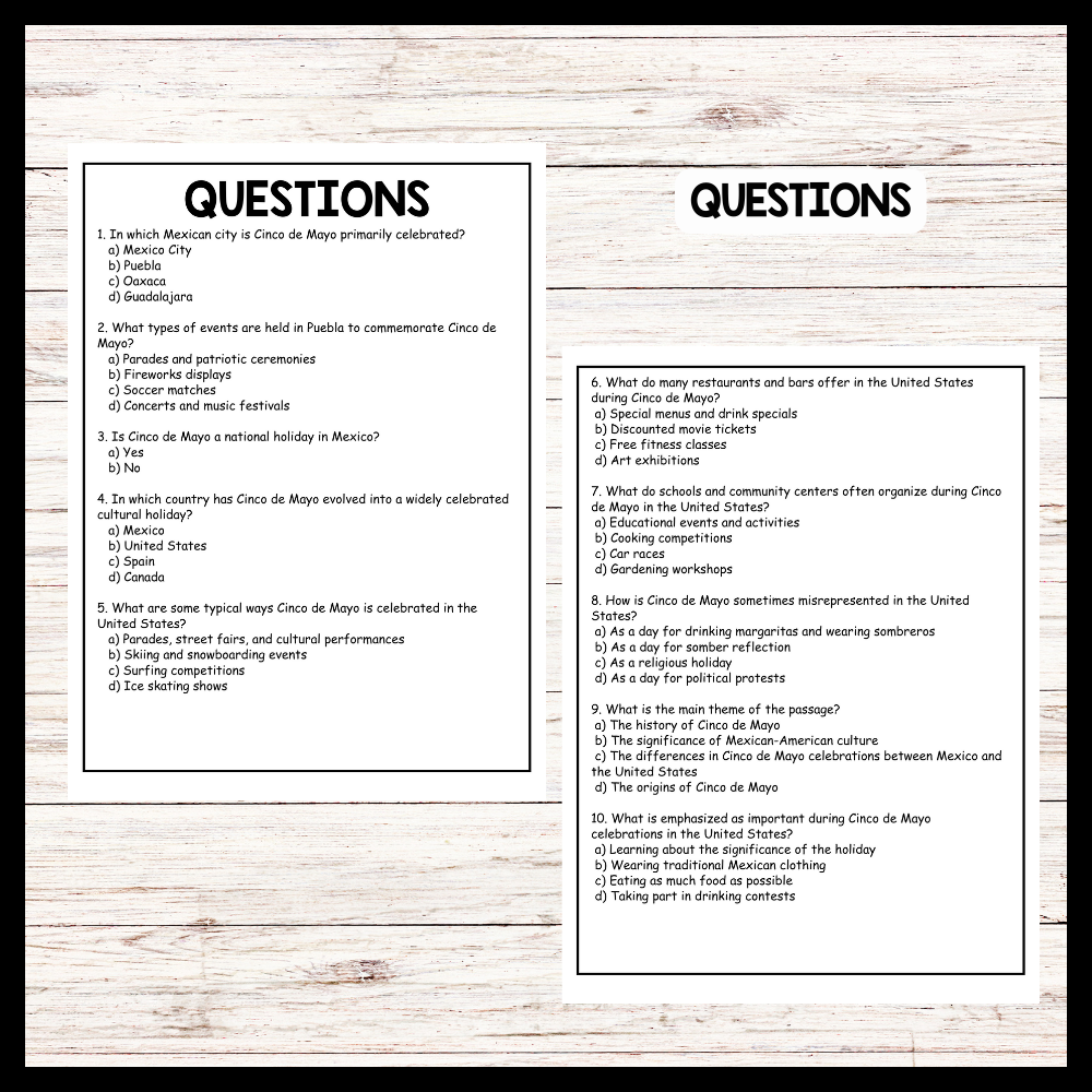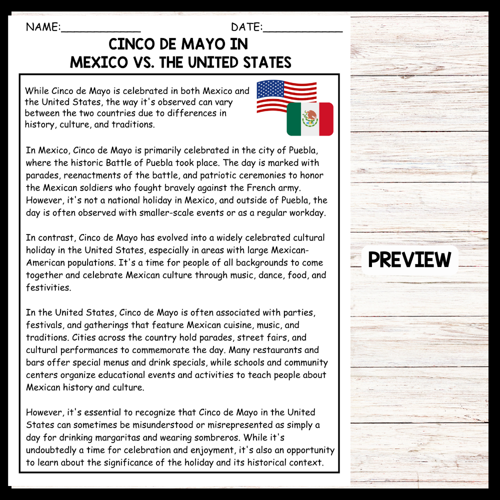 - "CINCO DE MAYO IN MEXICO VS. THE UNITED STATES" CINCO DE MAYO Reading Comprehension