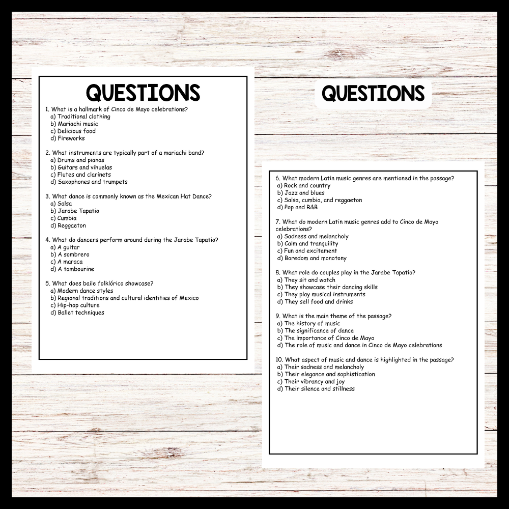 This passage provides insight into the vibrant music and dance traditions that are integral to Cinco de Mayo celebrations, offering teachers a valuable resource to enhance their students' understanding of Mexican culture. By describing the lively performances of mariachi bands, the energetic movements of dances like the Jarabe Tapatio and baile folklórico, and the contemporary Latin music genres enjoyed during the holiday, teachers can engage students in discussions about the diversity and richness of Mexican artistic expression. Furthermore, educators can use this passage to explore the cultural significance of music and dance in Mexican heritage and their role in fostering community connections and celebrating shared identity. Overall, the passage serves as a colorful depiction of the cultural festivities surrounding Cinco de Mayo, allowing teachers to incorporate music, dance, and cultural appreciation into their curriculum.