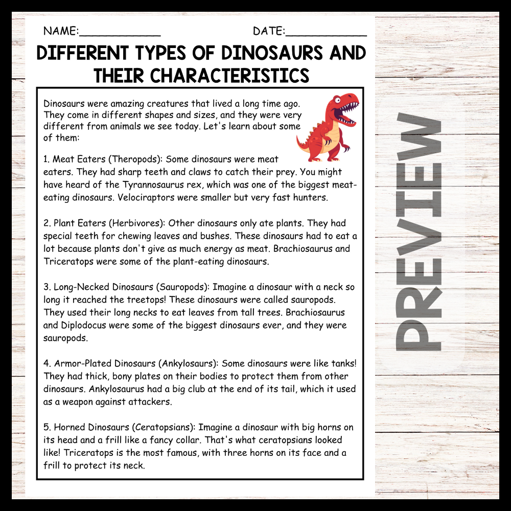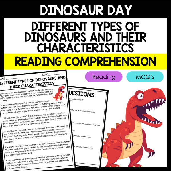 - "DIFFERENT TYPES OF DINOSAURS AND THEIR CHARACTERISTICS" DINOSAUR DAY Reading Comprehension