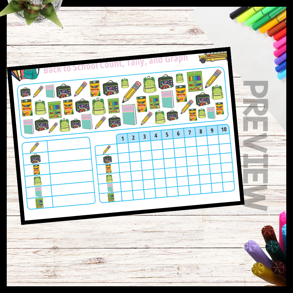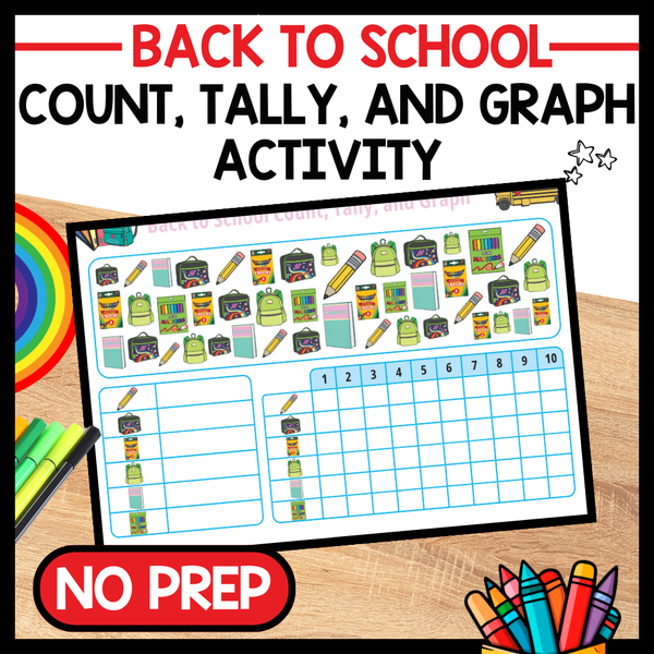 Utilize this First Grade Back to School Count, Tally, and Graph Activity to help students hone their counting and graphing abilities. Students will count objects, tally the numbers, and then color the graph to represent their findings. It's a delightful activity for the start of the school year!