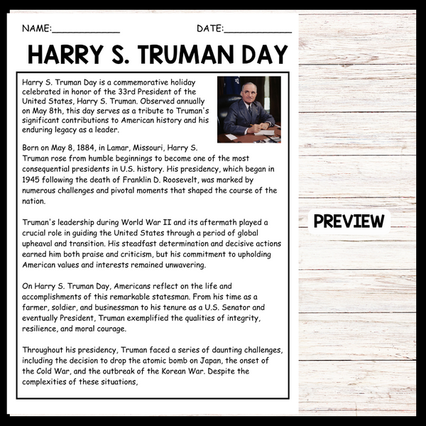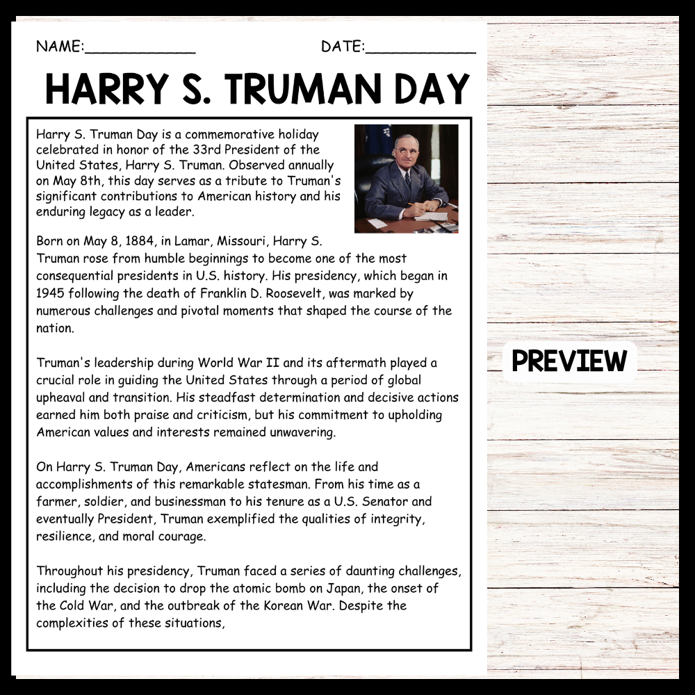 - "HARRY S. TRUMAN DAY" HARRY S. TRUMAN DAY Reading Comprehension