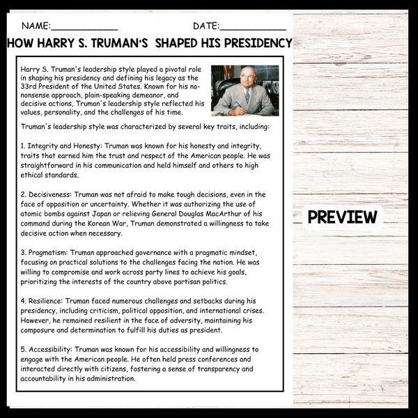 - "HOW HARRY S. TRUMAN’S SHAPED HIS PRESIDENCY" HARRY S. TRUMAN DAY Reading Comprehension