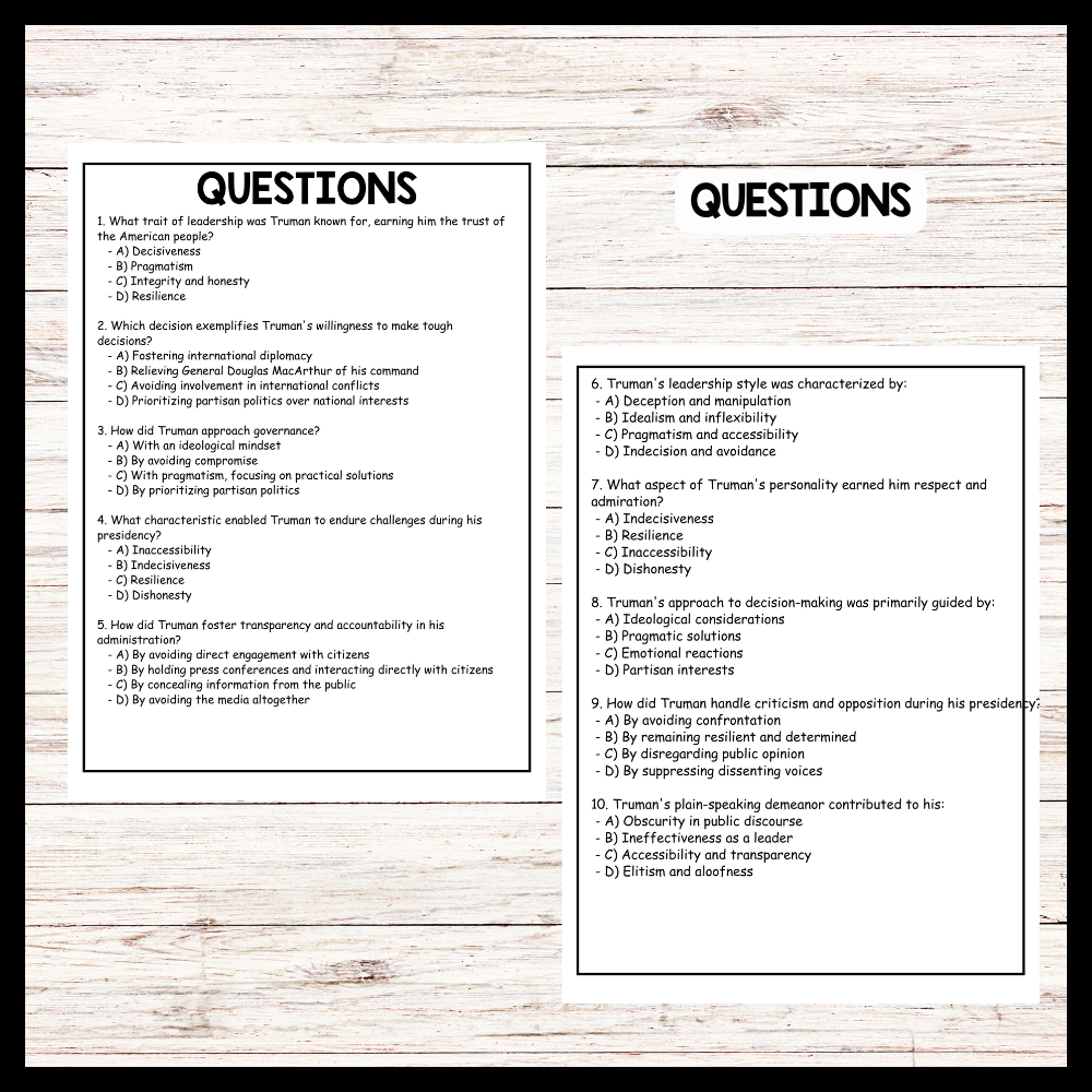 Truman's leadership style was marked by integrity, decisiveness, pragmatism, resilience, and accessibility. His honesty and straightforwardness earned him the trust of the American people, while his willingness to make tough decisions showcased his decisive nature. Truman's pragmatic approach to governance prioritized practical solutions over partisan politics, and his resilience in the face of challenges demonstrated his unwavering commitment to his duties as president. Additionally, Truman's accessibility and direct engagement with citizens fostered transparency and accountability in his administration, further enhancing his effectiveness as a leader.