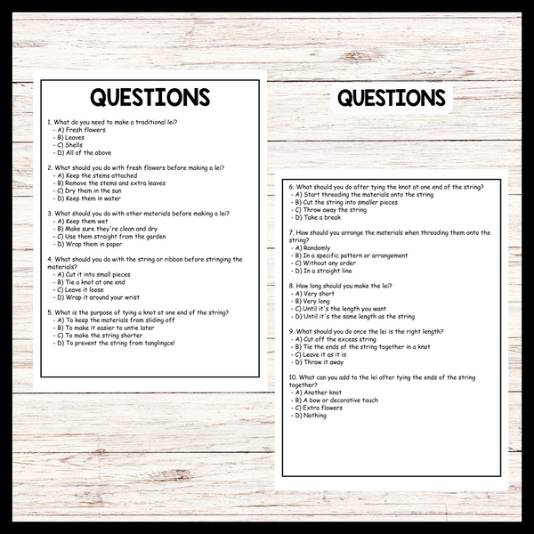 This set of instructions provides a clear and straightforward guide for making a traditional lei. It begins with gathering supplies, emphasizing the versatility of materials that can be used. Next, it instructs on preparing the materials, ensuring they are clean and ready for use. The steps for stringing the lei are then outlined, starting with securing the string and progressing through the threading process. The instructions encourage creativity by suggesting different patterns or arrangements for the materials. Finally, the process concludes with tying off the lei securely and adding optional decorative touches. Teachers can use these instructions to introduce a hands-on activity related to cultural traditions or crafts, promoting creativity and fine motor skills development among students. Through this activity, students can learn about different cultural practices and engage in a meaningful and enjoyable crafting experience.