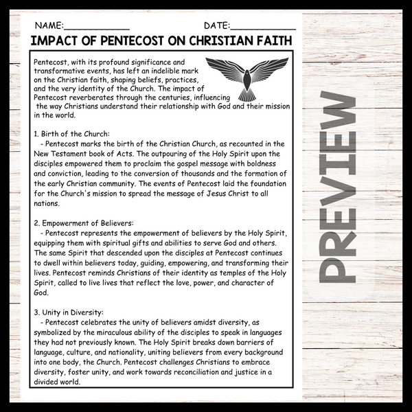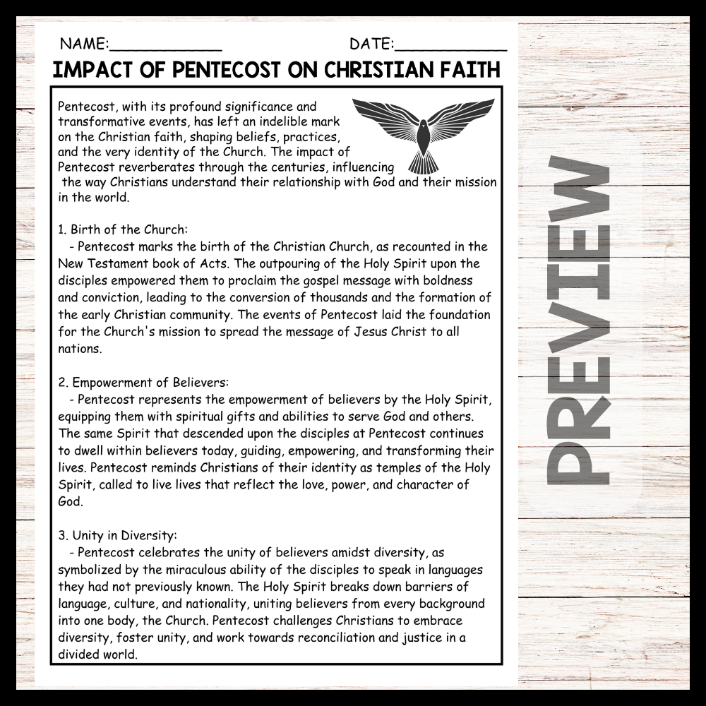 This passage highlights the profound significance of Pentecost in Christian theology and practice. It emphasizes Pentecost as the birth of the Christian Church, marking the empowerment of believers by the Holy Spirit and the formation of a diverse yet unified community. Teachers can use these points to explore the theological implications of Pentecost, including the role of the Holy Spirit in the life of believers, the mission of the Church, and the call to unity amidst diversity. Additionally, they can prompt discussions on how Pentecost inspires Christians to live out their faith boldly, serve others, and promote reconciliation and justice in society. Through reflection on the spiritual and social dimensions of Pentecost, students can deepen their understanding of Christian beliefs and values.