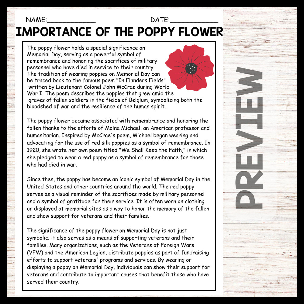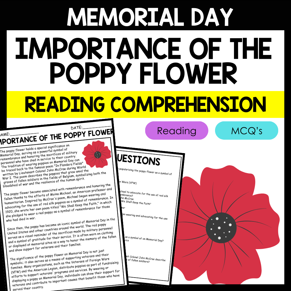 - "IMPORTANCE OF THE POPPY FLOWER" MEMORIAL DAY Reading Comprehension