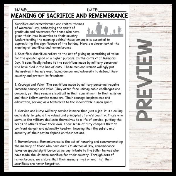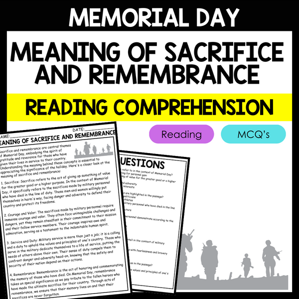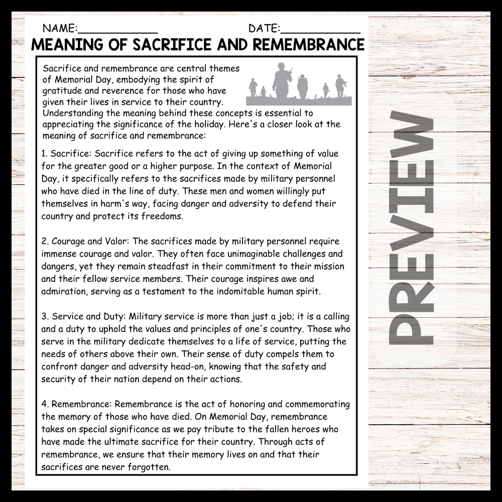 - "MEANING OF SACRIFICE AND REMEMBRANCE" MEMORIAL DAY Reading Comprehension