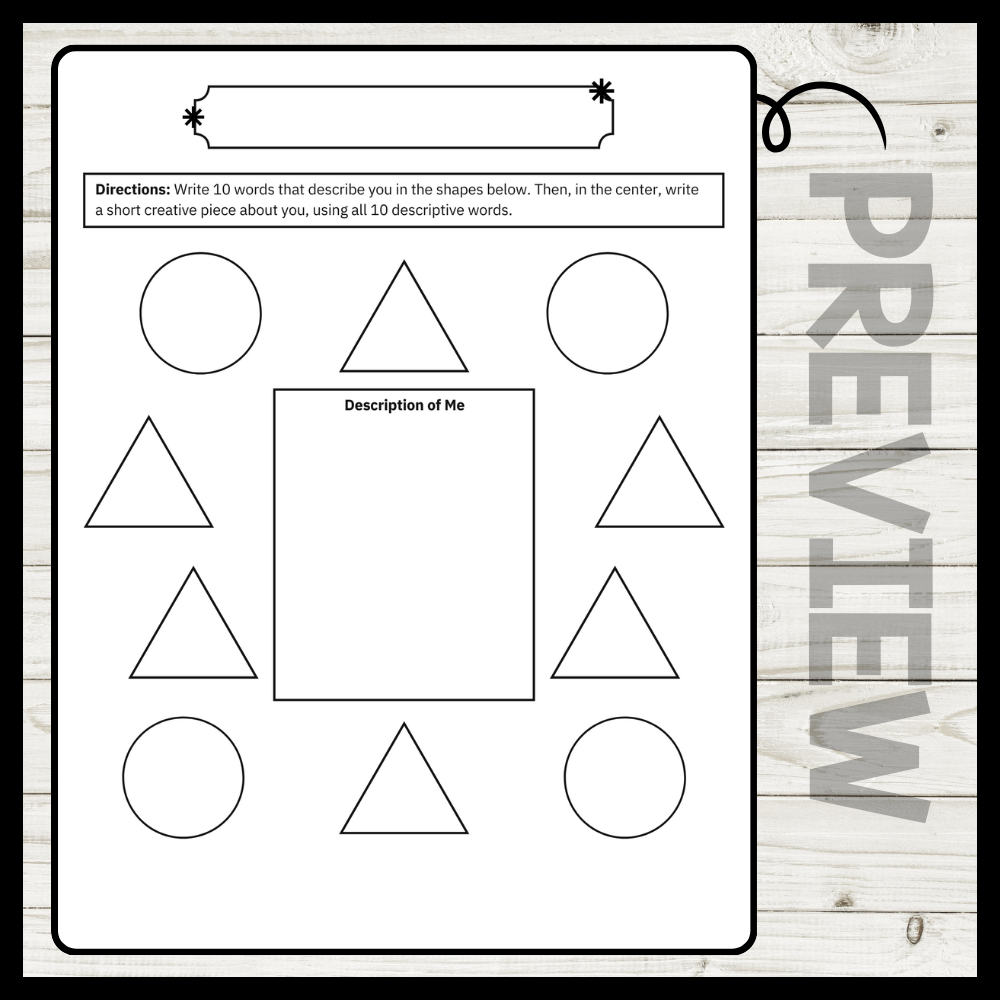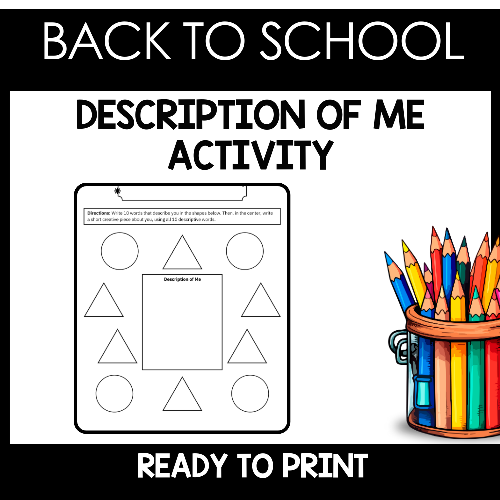Introduce your students to their new classmates with our "Description of Me Activity"! Participants will choose 10 words that describe themselves and use them to create a short paragraph, poem, or other creative piece. To extend the activity, students can also draw a self-portrait or something that symbolizes them. It's a great way to foster connection and self-expression at the beginning of the school year!