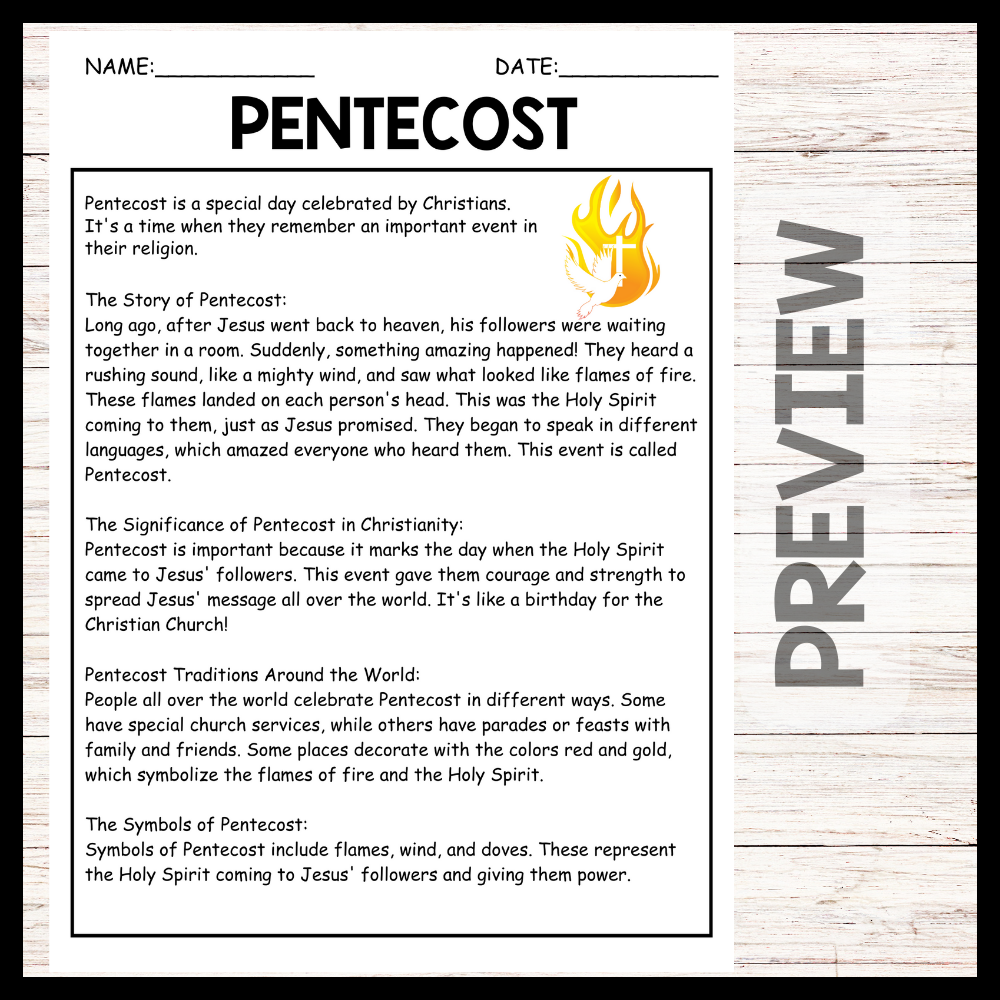 This passage provides a concise explanation of Pentecost, narrating the event's significance in Christianity, traditions associated with its celebration worldwide, and its symbolic representations. Its simplicity makes it an excellent resource for teachers to introduce Pentecost to students in an accessible manner, fostering understanding of key Christian beliefs and practices. Through this passage, students can engage with the story of Pentecost, its importance in the Christian faith, and its cultural significance in various traditions.