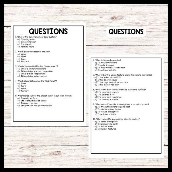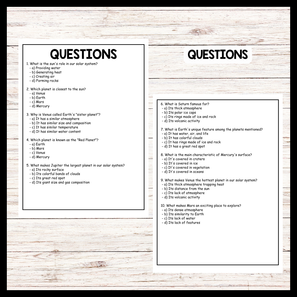 This passage provides a simple and clear overview of the planets in our solar system, highlighting key facts about the Sun, Mercury, Venus, Earth, Mars, Jupiter, and Saturn. It's a useful tool for teachers as it introduces students to basic astronomy concepts in an engaging and easy-to-understand manner.