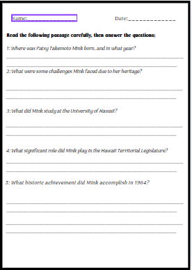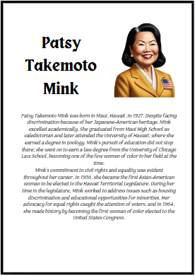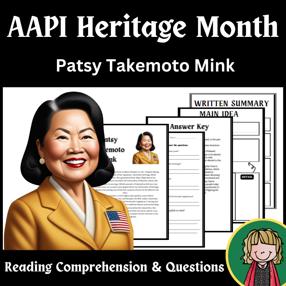 This reading comprehension focuses on the life and legacy of Patsy Takemoto Mink, the first woman of color elected to the U.S. Congress and a trailblazer for gender and racial equality. Born in Hawaii in 1927, Mink faced discrimination but persisted in her education, becoming a lawyer. As a congresswoman, she championed Title IX, a landmark law ensuring gender equity in education. The activity allows students to learn about her achievements, her fight against injustice, and her significant contributions to civil rights during Asian American and Pacific Islander Heritage Month.