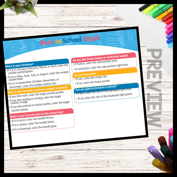 Get back into the school routine smoothly with our Back to School Backpack Glyph Activity. This activity encourages students to answer questions about themselves and share their thoughts on returning to the classroom.