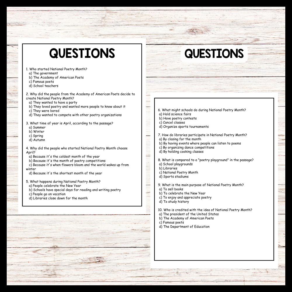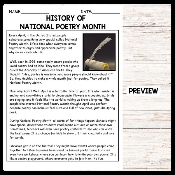 - "HISTORY OF NATIONAL POETRY MONTH" NATIONAL POETRY MONTH Reading Comprehension