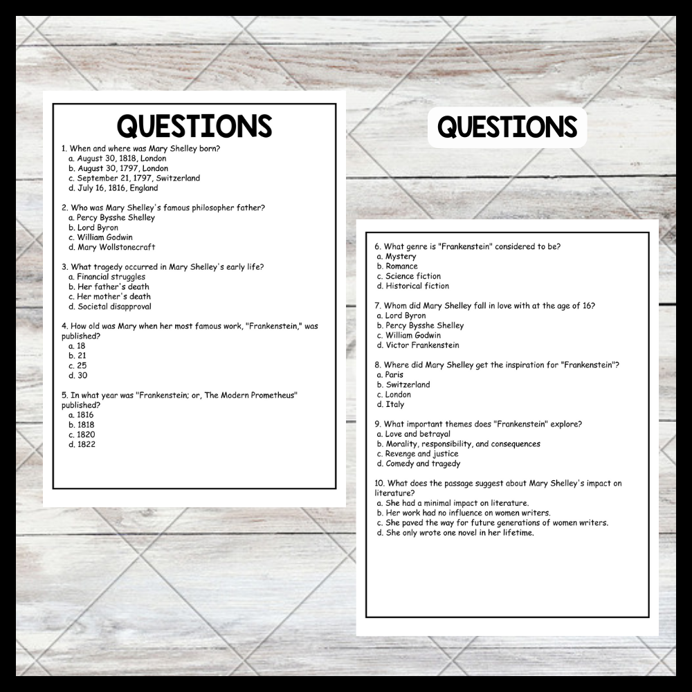 This passage offers a brief yet comprehensive overview of Mary Shelley's life and her most famous work, "Frankenstein." Teachers can use it to introduce students to Shelley's background, including her upbringing and the circumstances surrounding the creation of her iconic novel. The passage also touches on the themes explored in "Frankenstein," making it useful for discussions on literary analysis and the novel's significance in the context of Gothic literature and science fiction. Overall, it provides a concise introduction to Mary Shelley and her enduring contribution to literature.