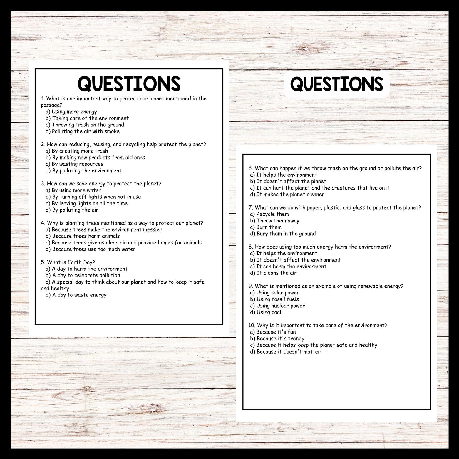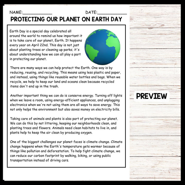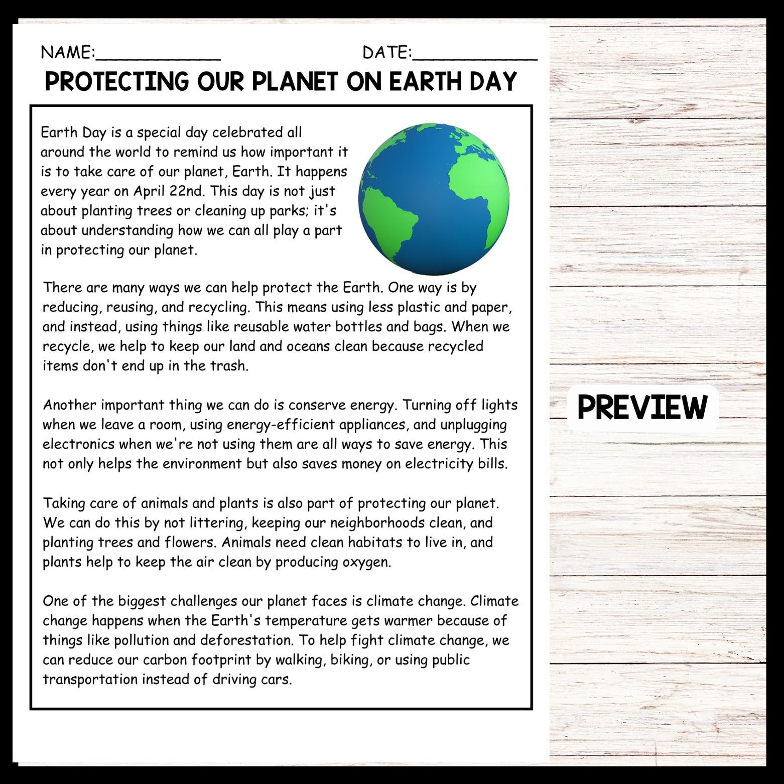 - "PROTECTING OUR PLANET ON EARTH DAY" EARTH DAY Reading Comprehension