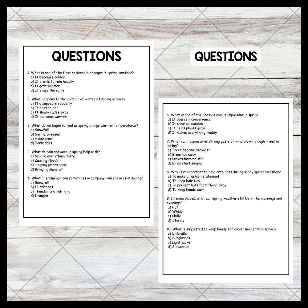 This passage describes the typical changes in weather during spring, highlighting the shift from winter's cold to warmer temperatures, the frequent rain showers, and the sometimes gusty winds. It emphasizes the gradual warming, the importance of rain for plant growth, and the need for light jackets during cooler times. This explanation is useful for teachers as it provides a clear and simple overview of spring weather, making it easy for students to understand and relate to the seasonal changes.