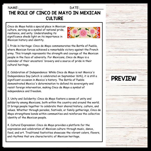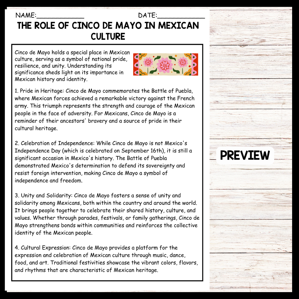 - "THE ROLE OF CINCO DE MAYO IN MEXICAN CULTURE" CINCO DE MAYO Reading Comprehension