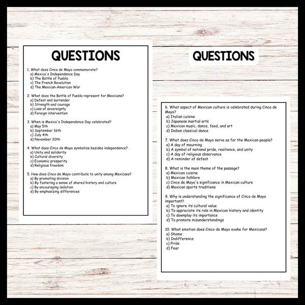 This passage delves into the multifaceted significance of Cinco de Mayo, emphasizing its role in honoring Mexican heritage, celebrating independence, fostering unity, and promoting cultural expression. It highlights the Battle of Puebla as a symbol of Mexican resilience and pride, reinforcing a sense of cultural identity and solidarity among Mexicans worldwide. Teachers can use this passage to explore the deeper cultural and historical meanings behind Cinco de Mayo, encouraging students to appreciate the holiday beyond its surface-level festivities.