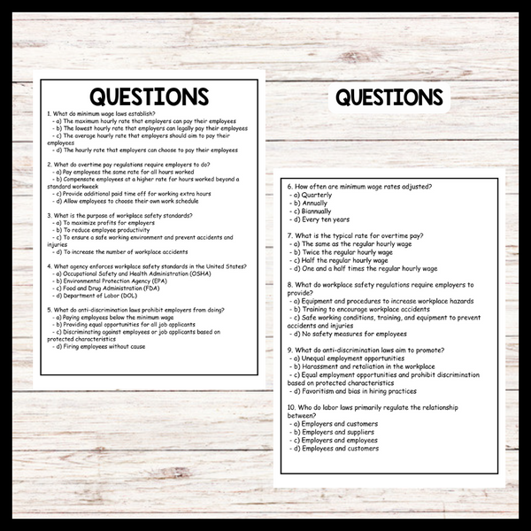 This passage explains key labor laws designed to protect workers: minimum wage laws ensure fair pay, overtime pay regulations compensate extra work, workplace safety standards prevent injuries, and anti-discrimination laws promote equality. It is useful for teachers because it succinctly outlines important legal protections in an accessible manner, helping students understand the rights and safeguards that support fair treatment in the workplace.