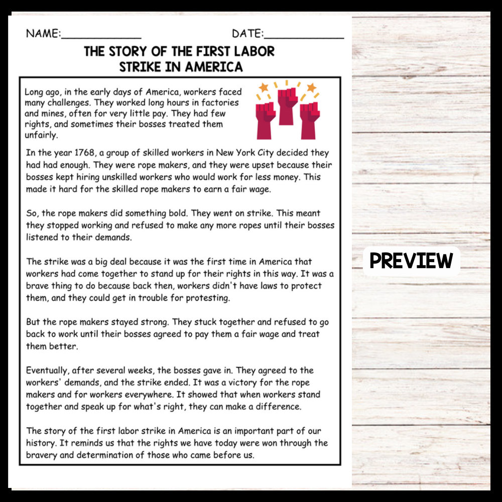 - "THE STORY OF THE FIRST LABOR STRIKE IN AMERICA" LABOR Day Reading Comprehension