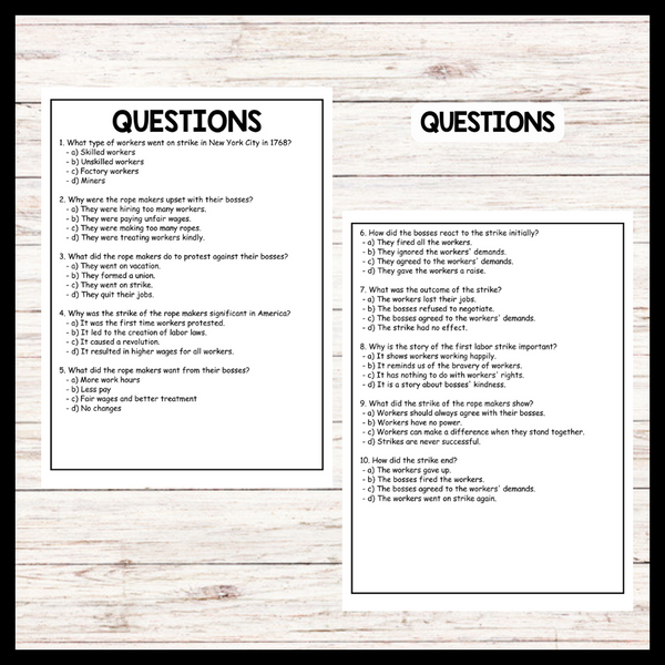 This passage recounts the story of the first labor strike in America in 1768 when New York City's rope makers protested against unfair wages and poor treatment. Their successful strike demonstrated the power of collective action and laid the groundwork for future labor rights movements. This overview is helpful for teachers as it presents a clear and engaging narrative, making it easy for students to grasp the historical significance of labor movements and the importance of worker solidarity.