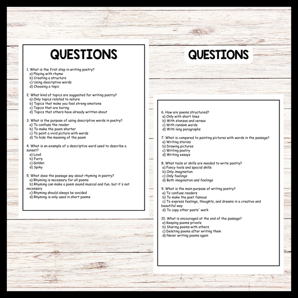 This passage offers a step-by-step guide for writing poetry, making it accessible and straightforward for students. Teachers can utilize this resource to introduce students to the art of poetry, providing clear instructions on selecting topics, using descriptive language, experimenting with rhyme, and creating varied structures. It's an invaluable tool for fostering creativity and literacy skills in the classroom, offering a practical approach to poetry writing that students can easily grasp and apply.